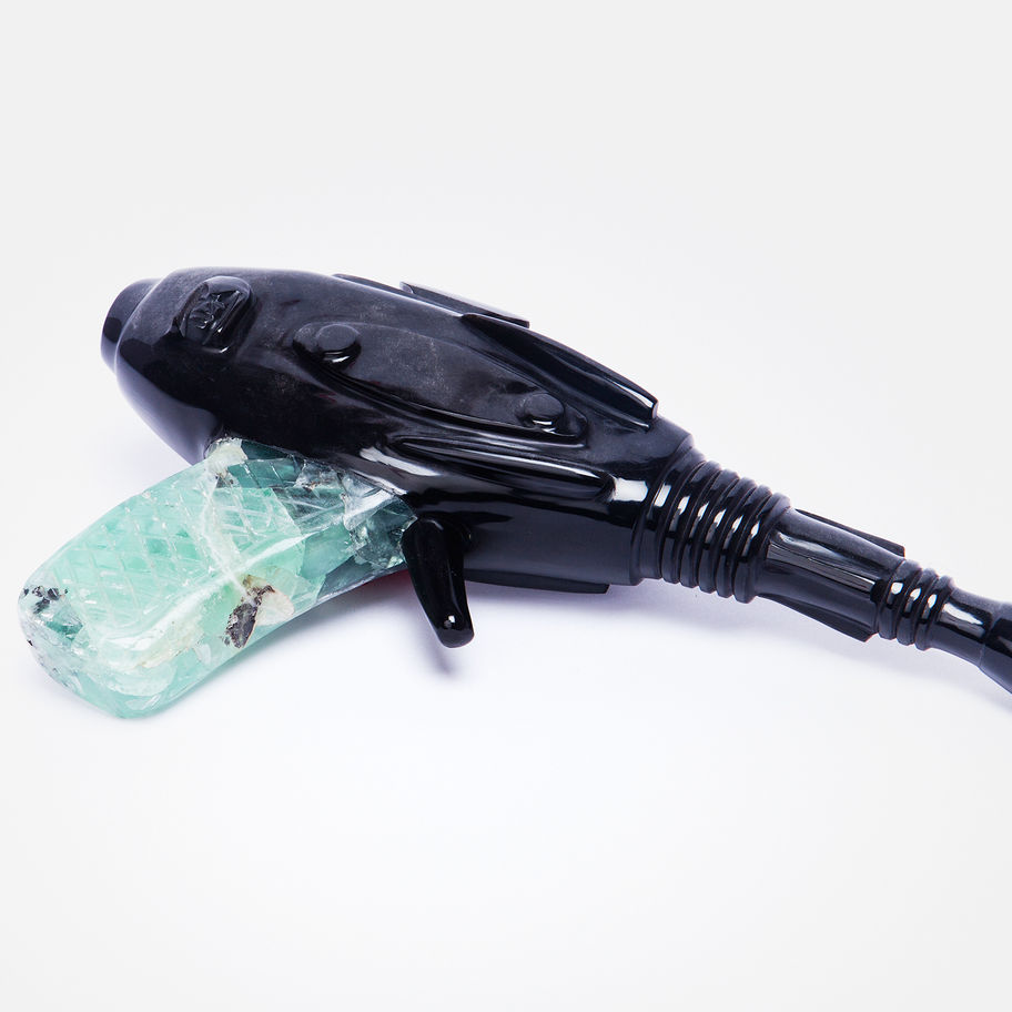 Figura de pistola laser de obsidiana plateada y mango de fluorita.