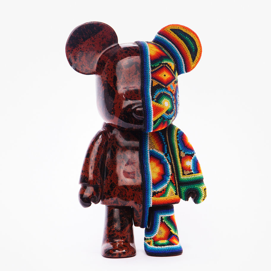 Figura de oso (qee bear) de obsidiana roja con intervenci6n de arte huichol.
